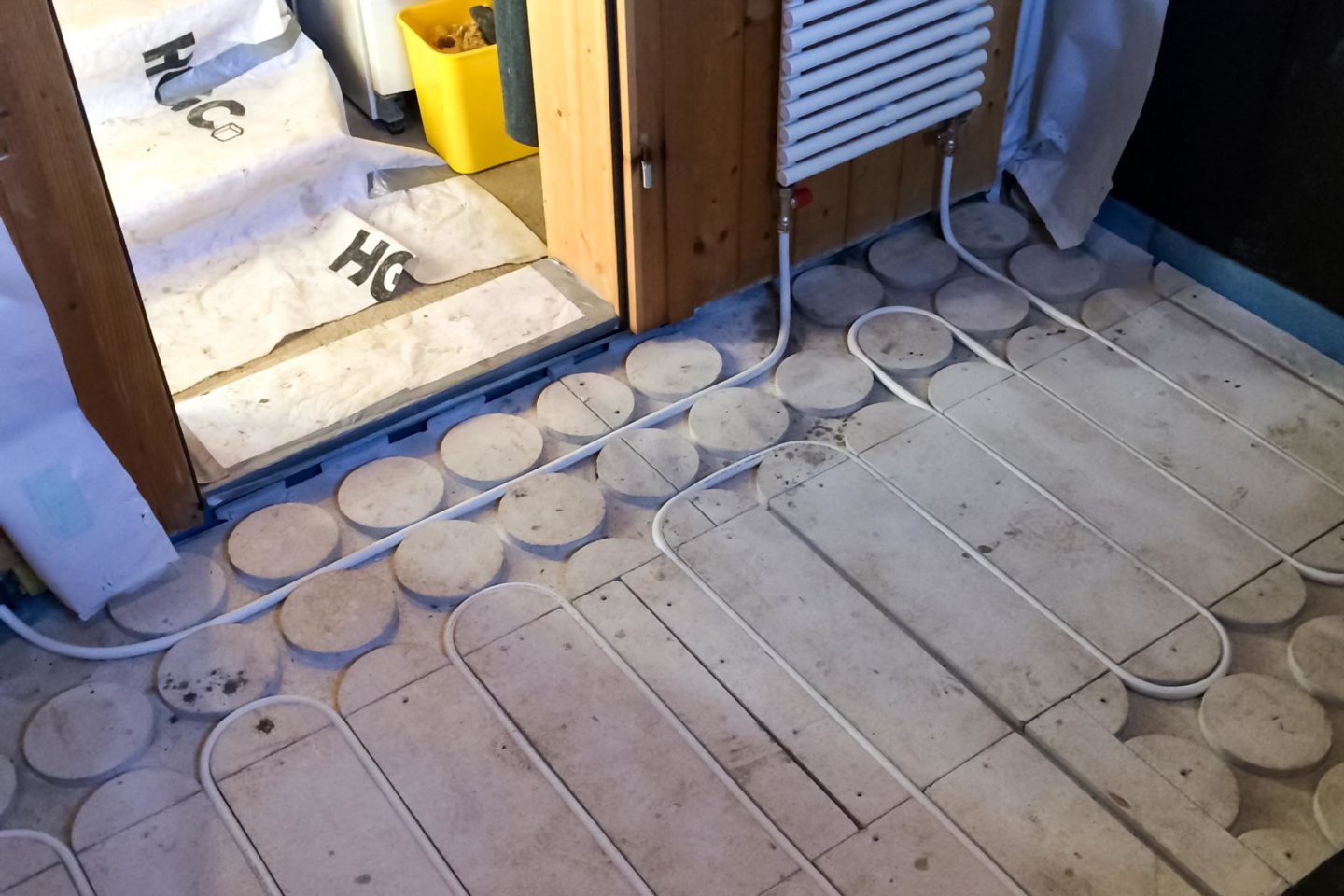 Nicht immer ist genügend Platz vorhanden für eine Fussbodenheizung im Untergrund. Bei diesem Umbau durften wir eine Bodenheizung installieren. Beim Umbauobjekt handelt es sich um ein etwas älteres Holzhaus, bei welchem nachträglich eine Bodenheizung eingebaut werden sollte. Um die Aufbauhöhe des Fussbodens samt Rohre dabei möglichst tief halten zu können, entschieden wir uns für diese Trockenbau Variante. Dabei verlegten wir die Rohre in gefräste OSB Platten. Damit verkürzt sich nicht nur die Trocknungszeit, sondern auch die gesamte Bauzeit. Auf diesem Aufbau konnte im Anschluss direkt ein Laminatboden verlegt werden.