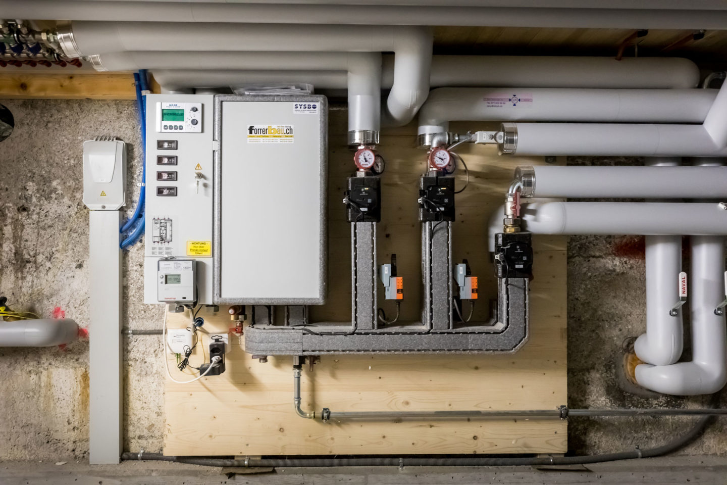 Technik muss funktionieren, soll aber zugleich nicht zu sehen sein und möglichst wenig Platz einnehmen. Genau diese Eigenschaften haben wir bei diesem Projekt vereint. In einem kleinen aber aufgeräumten Technikraum haben wir unter anderem eine Gasheizung, einen Speicher (Boiler), eine kontrollierte Wohnungslüftung, die Wasserverteilung der Bodenheizung sowie den Sicherungskasten für den Strom und die Verteilung des Frischwassers untergebracht.