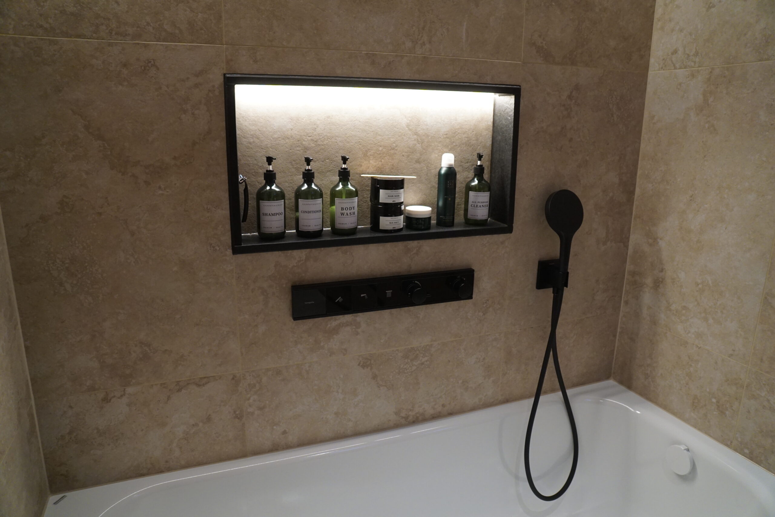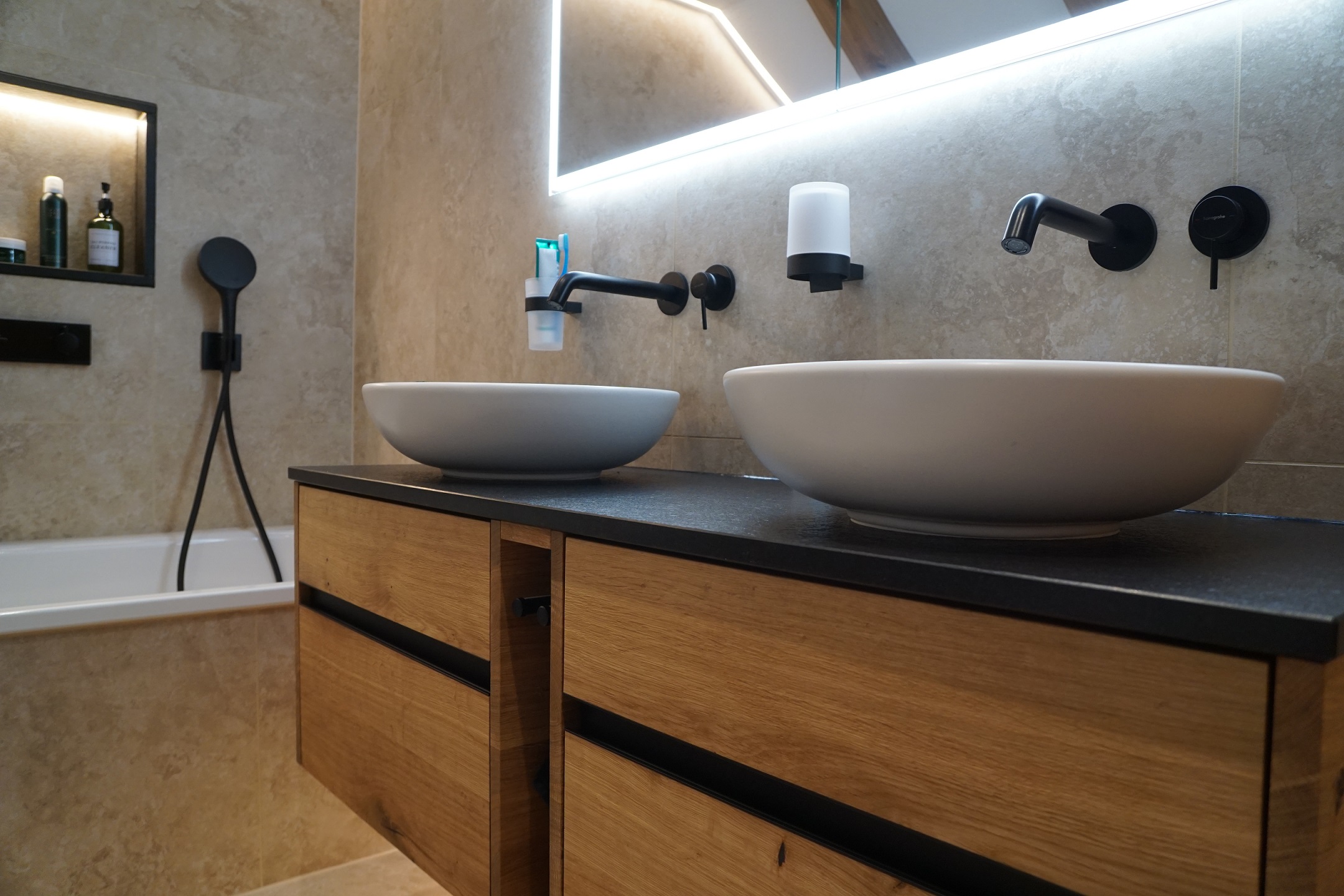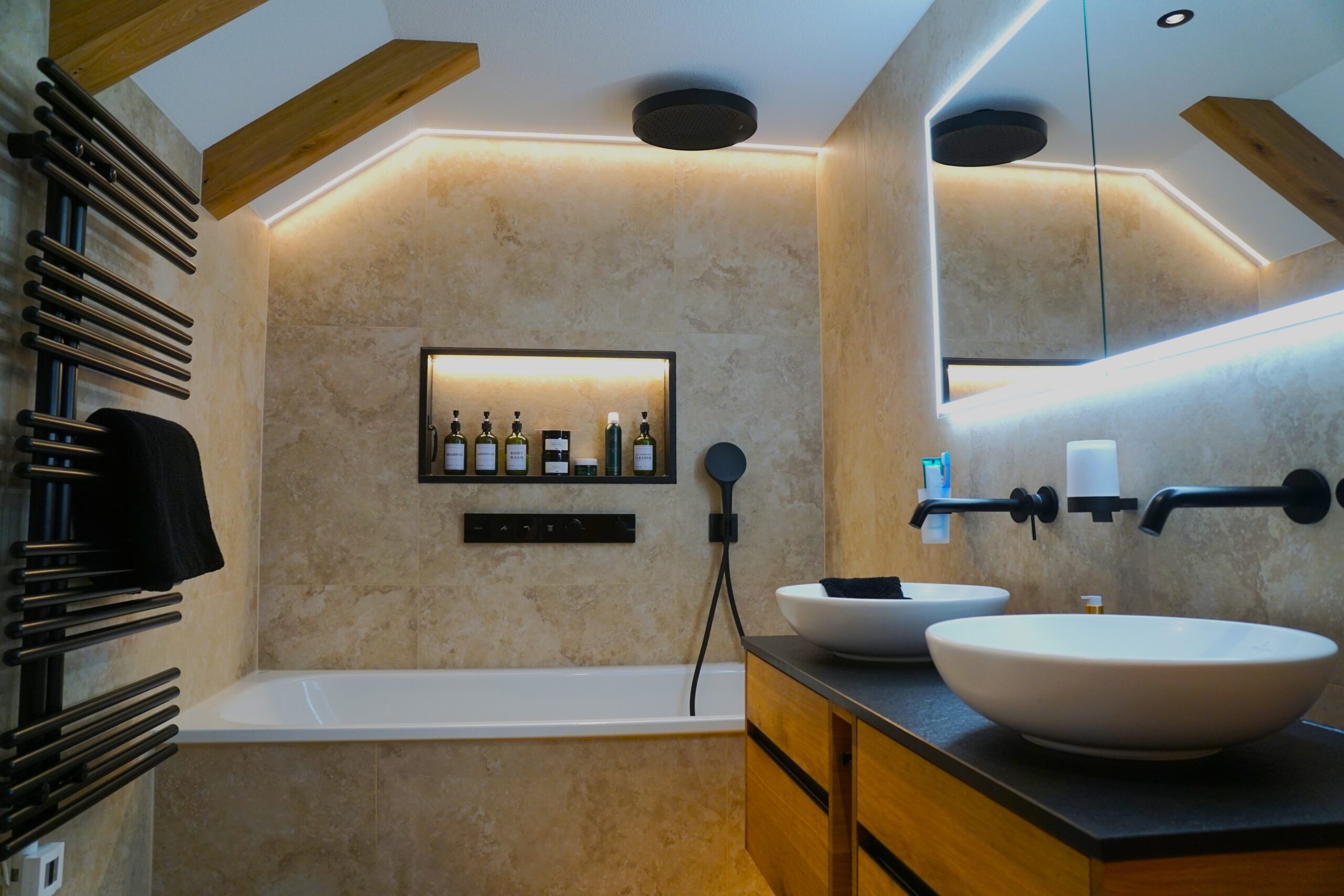 Das neu gestaltete Bad überzeugt mit einem harmonischen Zusammenspiel aus hellen Fliesen, schwarzen Armaturen und durchdachter Beleuchtung.