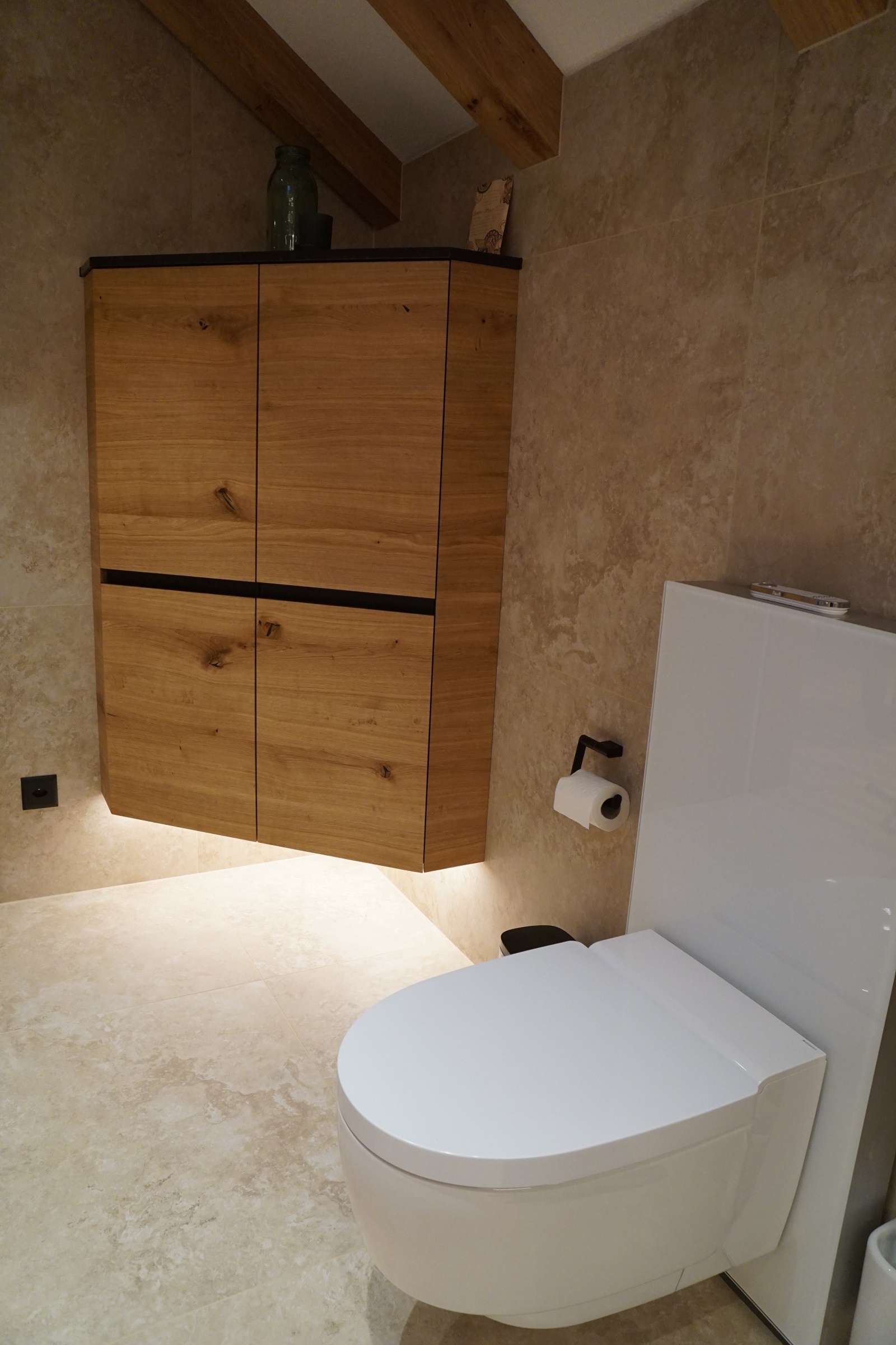 Aufgesetzte Lavabos und ein Dusch-WC setzen moderne Design-Akzente und werden durch clevere Stauraumlösungen ergänzt – für mehr Ordnung und Alltagstauglichkeit.